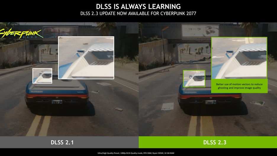 W DLSS 2.3 Nvidia zoptymalizowała wykorzystanie wektorów ruchu do poprawy szczegółowości przemieszczających się obiektów, rekonstrukcji cząsteczek, usuwania efektu smużenia i stabilności dynamicznej. Obraz w ruchu był po wyeliminowaniu poprzednich niedoróbek jedną z dalej pozostających większych wad w stosunku do natywne generowanego obrazu.