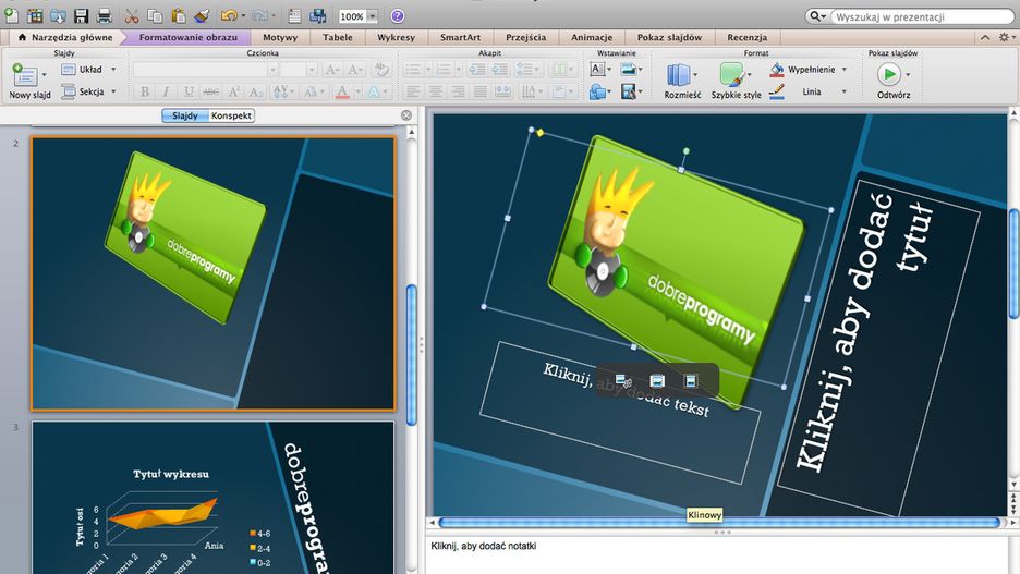 Praca w PowerPoincie okazała się zaskakująco wygodna. Na początku nie widziałam większej różnicy między nim a Keynote. Po stworzeniu kilku slajdów miałam uczucie, że PowerPoint jest nieco trudniejszy w obsłudze i bombarduje mnie wyborem efektów dla obiektów w prezentacji. Jednak edycja animacji jest intuicyjna, przeglądarka multimediów łatwa w obsłudze, tematy estetyczne i dobrej jakości, a moje ogólne wrażenia z pracy z tym programem pozytywne. Z takim wyborem szablonów przystosowanych do wysokiej rozdzielczości panoramicznych wyświetlaczy i doskonałej jakości przejściami PowerPoint jest już poważną konkurencją dla Apple Keynote. W galerii szablonów programu jest z czego wybierać, a jeden z nich wyglądał bardzo znajomo…[img=powerpoint-zmierzch]Opcje edycji grafik w PowerPoincie bardzo mi się spodobały, zwłaszcza możliwość łatwego dodania cienia i zmiany kolorów obrazu. Zaskakująco dobrze działa mechanizm usuwania tła, którego z pewnością będę używać. Z drugiej strony dodawanie efektów 3D działa inaczej, niż się spodziewałam i nie wydaje mi się, żebym znalazła dla nich zastosowanie. Jedynym efektem trójwymiarowym, który przypadł mi do gustu, jest obracanie obrazów, dzięki czemu można staworzyć iluzję perspektywy.