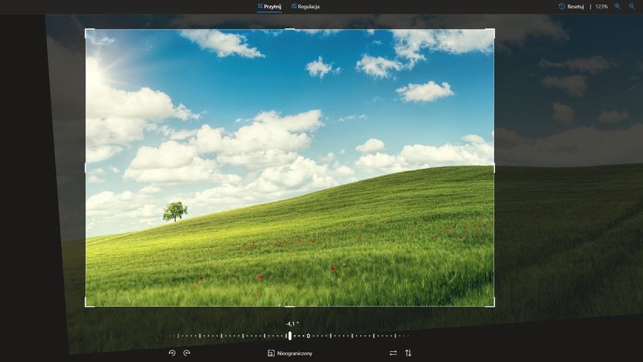 OneDrive pozwala więc fotografie przycinać (swobodnie lub zgodnie z predefiniowanymi proporcjami boków) i obracać, a następnie regulować. Tutaj do dyspozycji jest korekta jasności, naświetlenia, kontrastu, świateł i cieni. Dodatkowo można także edytować nasycenie, ciepło i odcień kolorów.