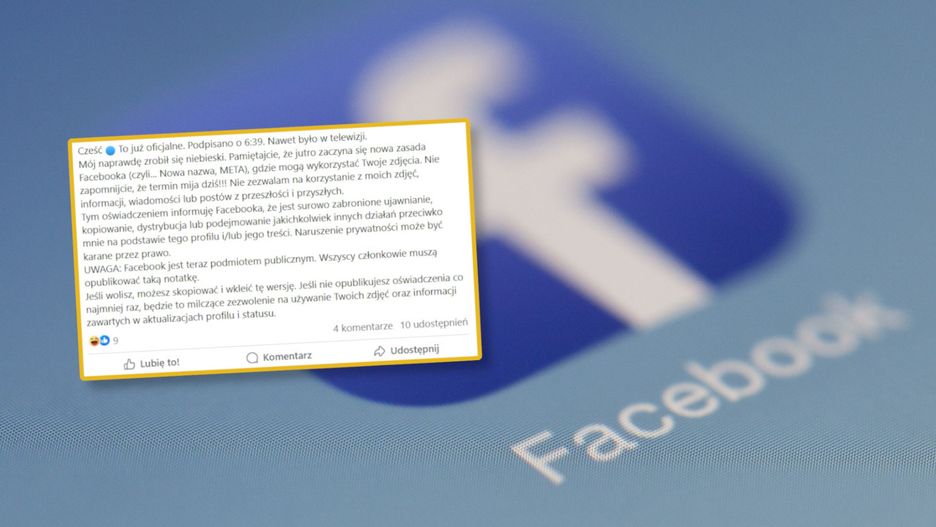 Nic bardziej mylnego. Różne formy "oświadczenia" pojawiającego się w postach nie mają żadnej mocy prawnej, choć temat cyklicznie od wielu lat wraca na języki użytkowników. Pierwsze posty tego rodzaju pojawiły się już w 2012 roku, a najnowszy łańcuszek sugeruje, że oświadczenie jest niezbędne w związku z "wprowadzanymi jutro" nowymi zasadami przy okazji zmiany nazwy na Meta. Przypominamy, że to zmiana z października 2021 roku, niezależna od ewentualnych modyfikacji regulaminu, które mogą być wprowadzane równolegle i każdy użytkownik Facebooka jest o nich informowany.