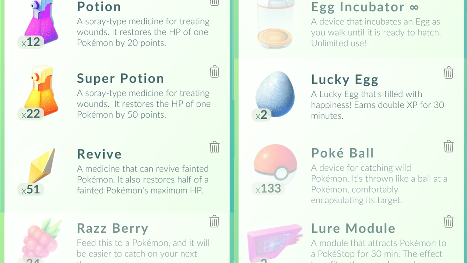Poke Ball: Podstawowa pułapka na Pokemony. Można ją kupić za monety lub zdobyć w PokestopieGreat Ball: Bardziej zaawansowana pułapka, przeznaczona do łapania trudnych i rzadkich PokemonówUltra Ball: Najlepsza pułapka. Można je kupić lub z odrobiną szczęścia zdobyć w PokestopieRazz Berry: Owoc, który ułatwia złapanie trudnego Pokemona. Można je zdobyć w Pokestopach po osiągnięciu 8. poziomuMaster Ball: Inaczej zwana Mewtwo catcher. Pułapka gwarantująca pochwycenie Pokemona. Była obecna w becie gry, w stabilnej prawdopodobnie się nie pojawiPokémon Egg: Jajko, z którego po inkubacji wykluje się Pokemon. Można je zdobyć przy Pokestopach. Inkubacja wymaga 2 lub 5 km spaceru (aplikacja liczy kroki, więc jazda samochodem się nie liczy)Egg Incubator: Inkubator, w którym można przygotować jajko do wyklucia. Na start gracz dostaje jeden inkubator z nieograniczoną liczbą użyć. Można też kupić lub zdobyć inkubatory pozwalające na 3-krotne wykorzystanieLucky Egg: Z tego jajka nie da się wyhodować Pokemona. Jajko podwaja liczbę zdobytych punktów doświadczenia przez 30 minutIncense: Kadzidło, które przyciąga Pokemony, także rzadsze. Można je zdobyć przy Pokestopach lub kupić, działa przez 30 minut. Czasami wpływa też na innych graczy w okolicyLure Module: Urządzenie, które umieszczone w Pokestopie przyciąga do niego Pokemony. Można je kupić lub dostać przy zyskaniu poziomu. Działa 30 minutPotion: Aerozol leczniczy, przywracający 20 punktów życia (HP) Pokemonowi po starciu na ringu. Użyteczne po 5. poziomie, można zdobyć w PokestopachSuper Potion: Aerozol przyzwracający 50 HP Pokemonowi, odblokowany na 10. poziomieHyper Potion: Płyn przywracający 200 HP, bardzo rzadki. Odblokowany na 15. poziomieRevive: Kryształ przywracający świadomość pokonanego Pokemona (któremu w starciu skończyły się HP) i część HPMax Revive: Środek przywracający świadomość Pokemona i maksymalną liczbę HPFraction: drużyna trenerów, oznaczona kolorem czerwonym (Valor), żółtym (Instinct) lub niebieskim (Mystic)Gym: ring, na którym trenerzy mogą wystawić swoje Pokemony na pojedynek z Pokemonami trenerów z innej frakcji oraz na sparring z Pokemonami z tej samej frakcji. Ringi mają reputację równą liczbie osadzonych na nich Pokemonów różnych trenerów. Przejęcie ringu wymaga pokonania wszystkich Pokemonów i stoczenia liczby walk równej reputacji ringuPokestop: Przystanek, za którego odwiedzenie otrzymasz darmowe przedmiotyPokecoins: Waluta gry, za którą można kupić przedmioty. Zarabia się broniąc ringów, można też kupić za prawdziwe pieniądzeCamera: Albo Pokémon Snap – aparat w aplikacji, pozwalający zrobić zdjęcie spotkanego Pokemona z poziomu ekranu łapania goItems, Bag: Plecak trenera, w którym można przechowywać początkowo 350 przedmiotów (zdarza się, że zmieści się tam więcej, jeśli zostaną dostarczone na przykład przy awansie na kolejny poziom trenera). Pojemność plecaka można powiększyć za monety – lepsza wersja kosztuje 200 pokecoinsPokedex: Katalog Pokemonów
