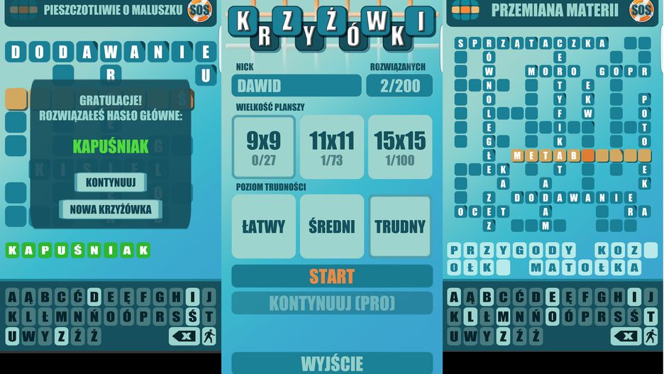 Otrzymujemy możliwość rozwiązywania krzyżówek o rozmiarach 9×9 liter, 11×11 i 15×15 na poziomie łatwym, średnim i trudnym. Trudność łamigłówki nie jest związana z poziomem trudności haseł, ale ze sposobem rozwiązywania – łatwe podświetlają prawidłowo wpisane litery, średnie podświetlają tylko prawidłowo uzupełnione hasła, trudne zaś w ogóle nie pomagają.