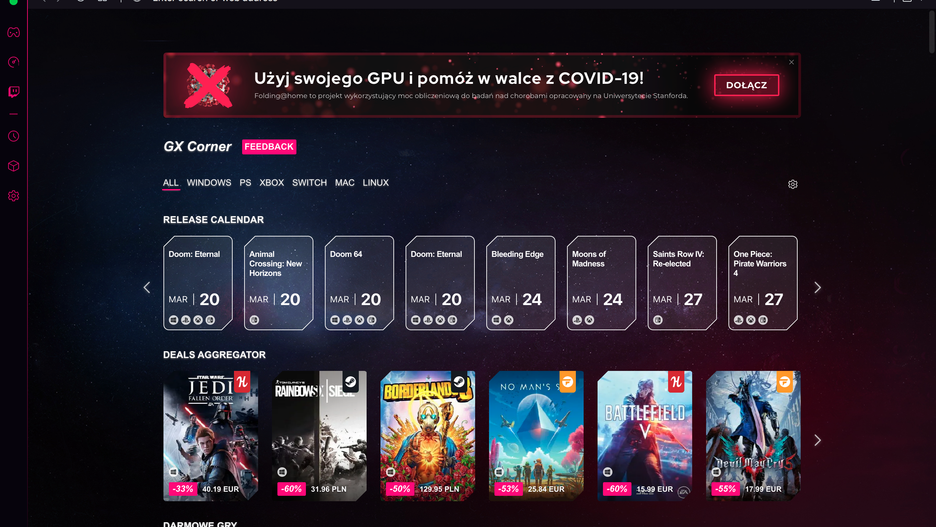 Projekt Folding@Home ma na celu przeprowadzanie symulacji zachowania białek i projektowanie nowych leków. Korzystając z opracowanego na Uniwersytecie Stanforda oprogramowania klienckiego, ochotnicy mogą automatycznie pobrać i obliczać porcję danych przeznaczoną dla wybranego zagadnienia. Ostatnio projekt wzbogacił się właśnie o symulacje związane z koronawirusem. Wzięcie udziału w obliczeniach pozwoli szybciej zrozumieć proces zarażania i namnażania wirusa, a konsekwencji – przyspieszy dostępność terapii i szczepionek. W akcję włączyła się też m.in. przeglądarka Opera, która w swojej specjalnej wersji dla graczy - Opera GX - umieściła specjalny baner prowadzący do informacji o akcji.