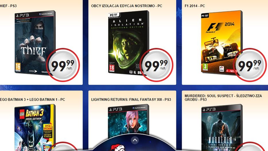 Najdroższe produkcje kosztują 99,99 zł i za tą cenę na PC-ty kupimy: LEGO Batman 3 + Lego Batman 1, Thief, Obcy Izolacja (Edycja Nostromo) i F1 2014. Na Xboksa 360 możemy kupić: Earth Defense Force 2025, Lightning Returns: Final Fantasy XIII, Murdered: Soul Suspect, PayDay 2, Resident Evil Revelations, Skyrim: Legendary Edition, The Walking Dead GotY, a także Yaiba: Ninja Gaiden Z. Natomiast na PS3 na sklepowych półkach znajdziemy: Earth Defense Force 2025, Lightning Returns: Final Fantasy XIII, Murdered: Soul Suspect, Resident Evil Revelations, Sacred 3, Saints Row IV Game of the Century Edition, The Walking Dead GotY oraz Thief.