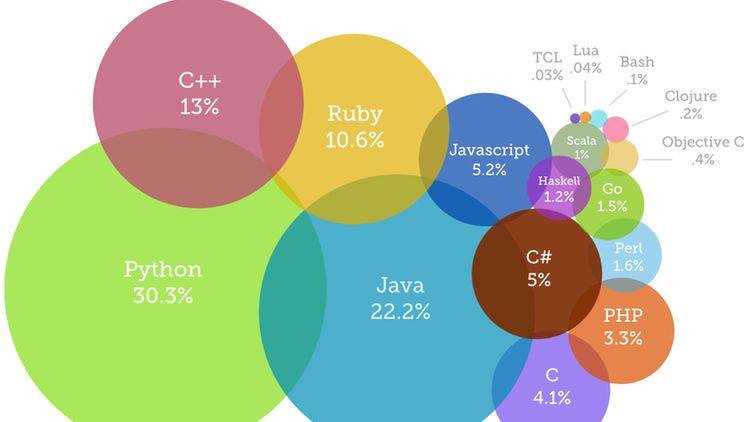 Jest już kolejne podsumowanie preferencji w językach kodowania wśród pracodawców. Tabela przedstawia szczegółowe dane z ostaniach trzech lat. Wyróżnia się oczywiście uniwersalny Python (30,3%), który zdeklasował konkurencję. Niewiele dalej jest Java (22,2%) oraz C++ i Ruby, którym udało się przekroczyć barierę 10%. Warto odnotować duży wzrost Objective-C (wzrost o 300% w porównaniu z rokiem wcześniejszym, do 0,4%) oraz C# (wzrost o 100%, do 5%). Spadek z roku na rok notuje PHP i obecnie wymagany był tylko w 3,3% zadań. Coraz mniej popularny językiem staje się również Perl, który w tym roku miał spadek na poziomie 20%.