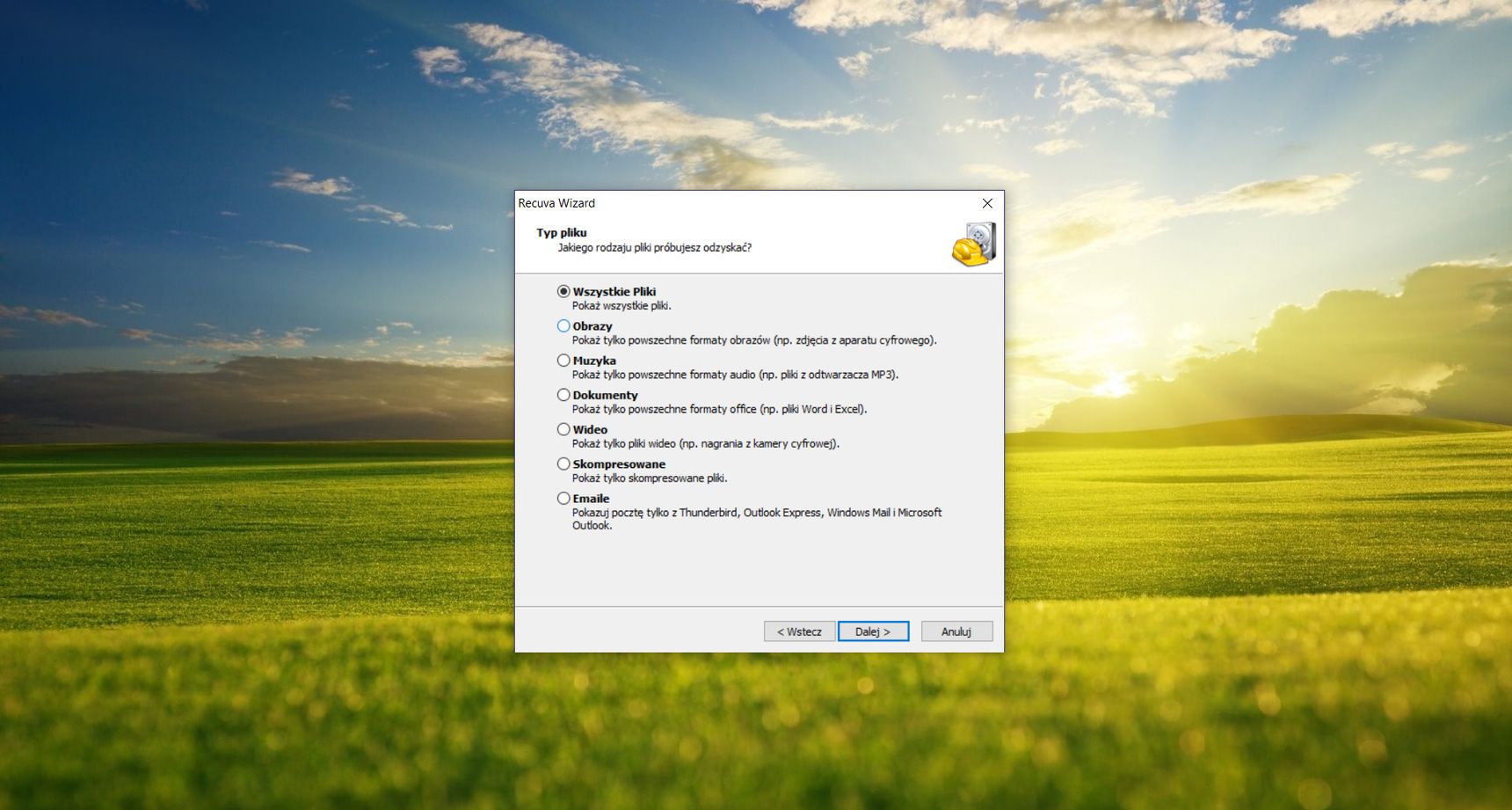 Program domyślnie uruchamiany jest w trybie kreatora odzyskiwania danych, który przeznaczony jest dla mniej doświadczonych użytkowników. W kilku prostych krokach przeprowadzi on nas przez cały proces odzyskiwania danych. Pracę z narzędziem rozpoczniemy od zdefiniowania typu plików jakie chcielibyśmy odzyskać. Recuva potrafi wyszukać wszystkie utracone pliki, obrazy, muzykę, dokumenty, wideo, skompresowane oraz wiadomości e-mail (z klientów poczty Thunderbird, Outlook Express, Windows Mail oraz MS Outlook).