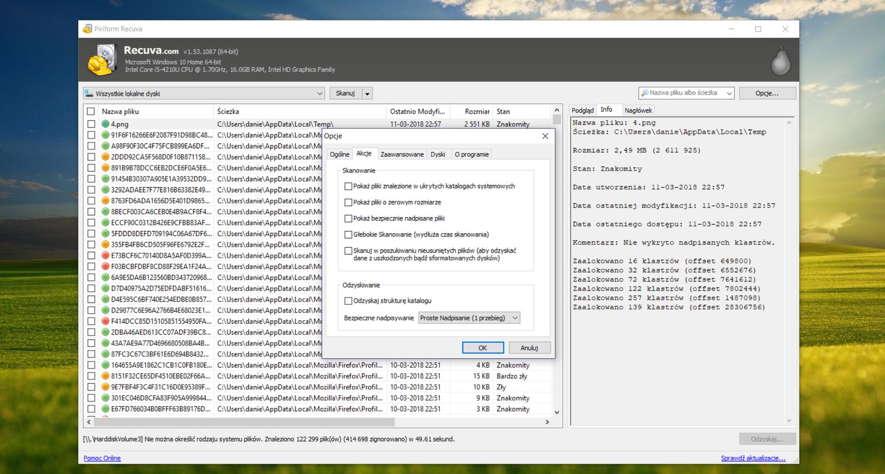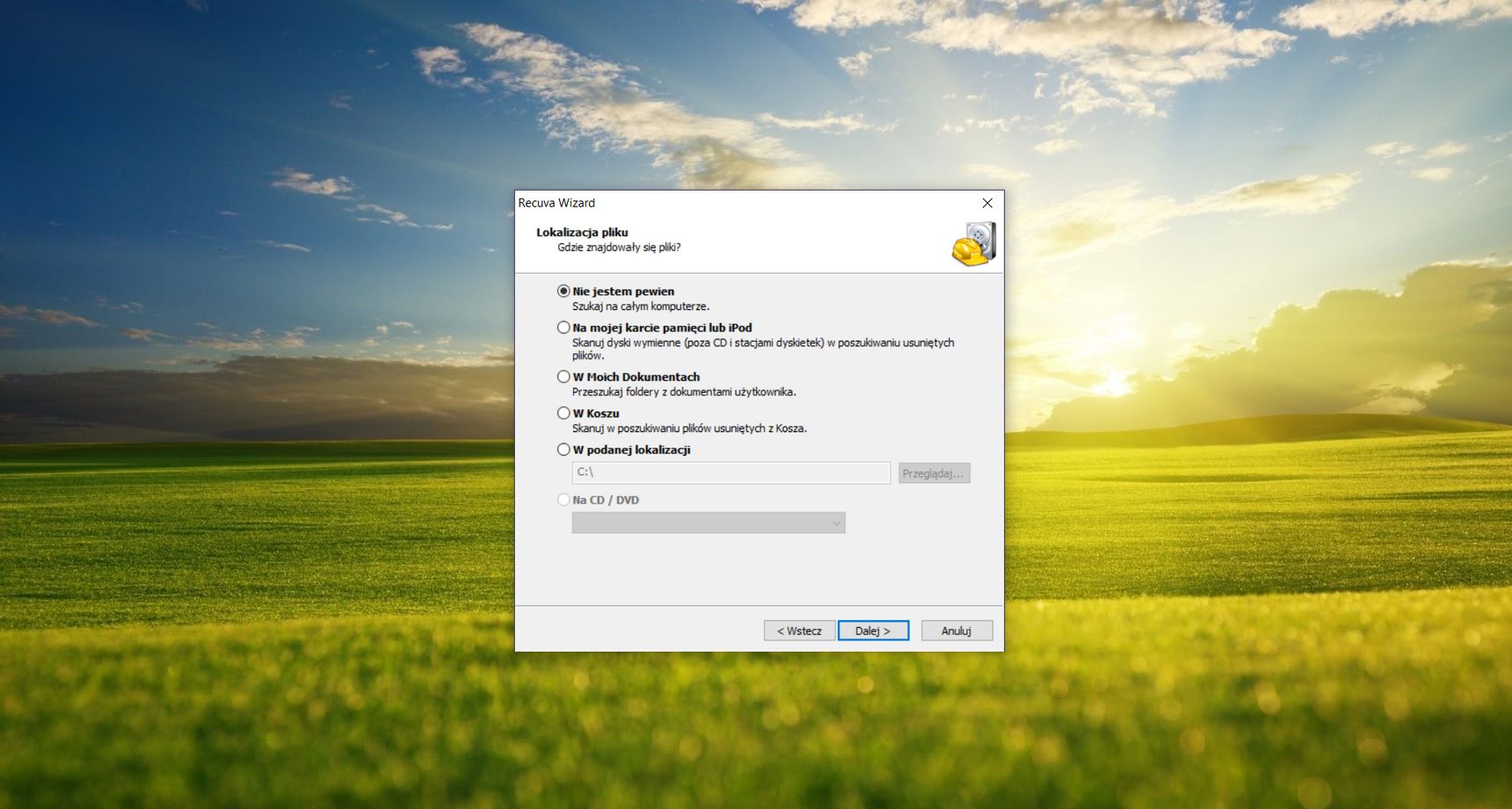Kolejny krok pracy wspomnianego kreatora to definiowanie lokalizacji, w której znajdowały się utracone dane. Recuva pozwala na skanowanie pełnej zawartości dysku twardego, predefiniowane lokalizacje (np. Moje dokumenty, Kosz), jak również dowolne, wskazane przez użytkownika foldery. Narzędzie doskonale sprawdza się w odzyskiwaniu danych z dysków twardych w komputerze, przenośnych magazynów danych, kart pamięci czy nawet urządzeń mobilnych. Dalszy etap to podsumowanie i możliwość skorzystania z funkcji dokładnego skanowania (Głębokie skanowanie), które poza tym, że trwa dłużej to umożliwia bardziej szczegółowe wyszukanie skasowanych danych.