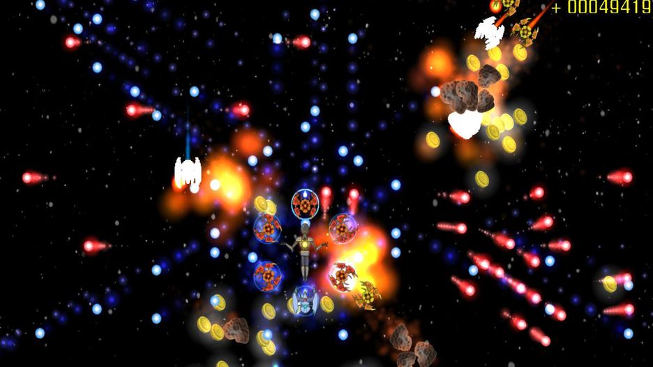 Gra stawia raczej na ilość obiektów mogących nas zniszczyć niż na sztuczną inteligencję nieprzyjaciół. Napierają oni bez przerwy z góry ekranu, co zresztą stanowi główną oś całej rozgrywki, ale podstawowym problemem jest nie tyle ich zbijanie, co przedzieranie się przez kolorowe odłamki, pociski, strumienie ognia oraz iluminujące przedmioty nie tracąc przy tym z oczu swojego statku. Z pokonanych przeciwników sypią się monety, dzięki którym gracz realizuje plan podstawowy czyli systematyczne powiększanie dorobku punktowego.
