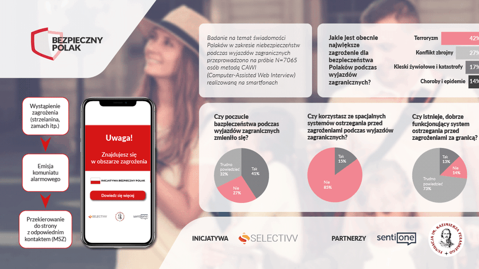 „Bezpieczny Polak” - to inicjatywa społeczno-technologiczna, która powstała w obliczu rosnącego zagrożenia terroryzmem, niepokojów społecznych związanych z kryzysem migracyjnym czy klęsk żywiołowych, w których niezwykle istotne jest natychmiastowe dotarcie do osób będących w strefie zagrożenia i powiadomienie ich o zaistniałym niebezpieczeństwie. Z badań przeprowadzonych przez firmę Selectivv w czerwcu tego roku* wynika, że ponad 40% Polaków na przestrzeni ostatnich kilku lat zmieniło swój stosunek do bezpieczeństwa podczas wyjazdów zagranicznych. Badanie ujawnia również, że ponad 60% ankietowanych za najważniejsze zagrożenia podczas pobytu za granicą wskazuje terroryzm oraz konflikty zbrojne. Jednocześnie na pytanie czy podczas wyjazdów zagranicznych korzysta Pan/Pani ze specjalnych systemów lub aplikacji informujących o zagrożeniu 85% udzieliło odpowiedzi negatywnej.