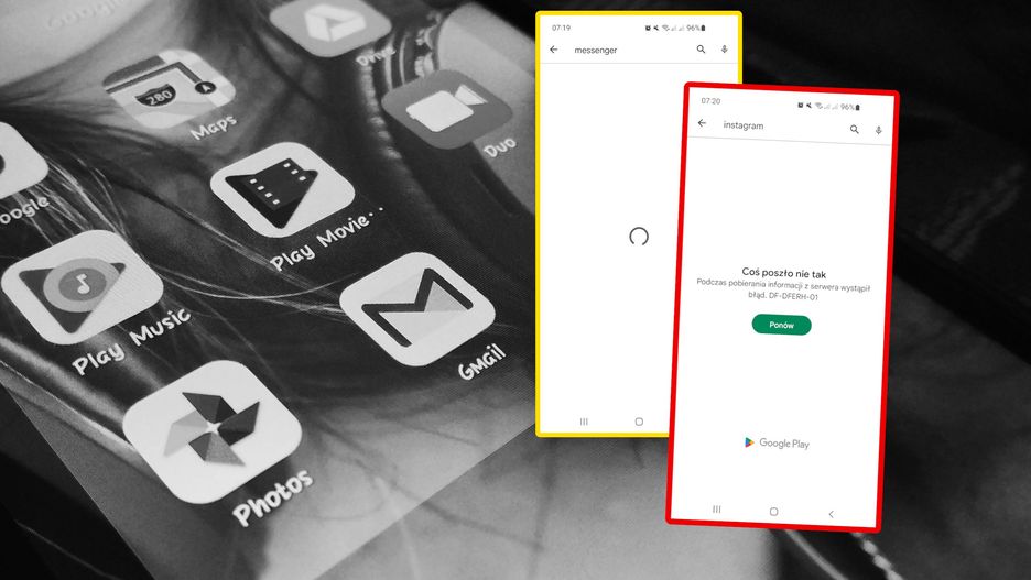 Chcąc włączyć Google Play z poziomu komputera, na ekranie pojawia się błąd 500, z kolei w smartfonie trafiliśmy dotychczas na dwa scenariusze - wyjątkowo powolne działanie aplikacji lub po prostu odmowę wyszukiwania aplikacji, co skutkuje błędem DF-DFERH-01 i komunikatem "Coś poszło nie tak".