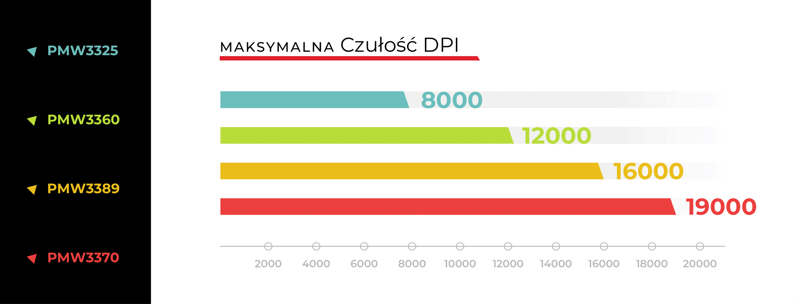 Nowe "oczko" PMW3370 od firmy PixArt jest rewolucją w świecie gamingowych akcesoriów. Jedną z jego kluczowych cech jest możliwość pracy z maksymalną czułością od zaledwie 50 aż do nawet 19 000 DPI. Niebywała precyzja w połączeni z szerokim zakresem rozdzielczości DPI do wyboru daje ogromne możliwości dostosowania pracy sensora pod wymagania i styl pracy lub gry użytkownika. Ponadto sensor daje możliwość dostosowania LOD, czyli "Lift-Off Distance" w zakresie od 1 do 2 mm. Dzięki tej funkcji możliwe jest ustawienie odległości myszy od podkładki, na której przestaje ona rejestrować ruch. Jest to bardzo ważny współczynnik dla wszystkich zawodowych graczy e-sportowych, którzy przeważnie korzystają z niskich nastaw czułości oraz wykonują długie, zamaszyste ruchy "gryzoniem" po podkładce.