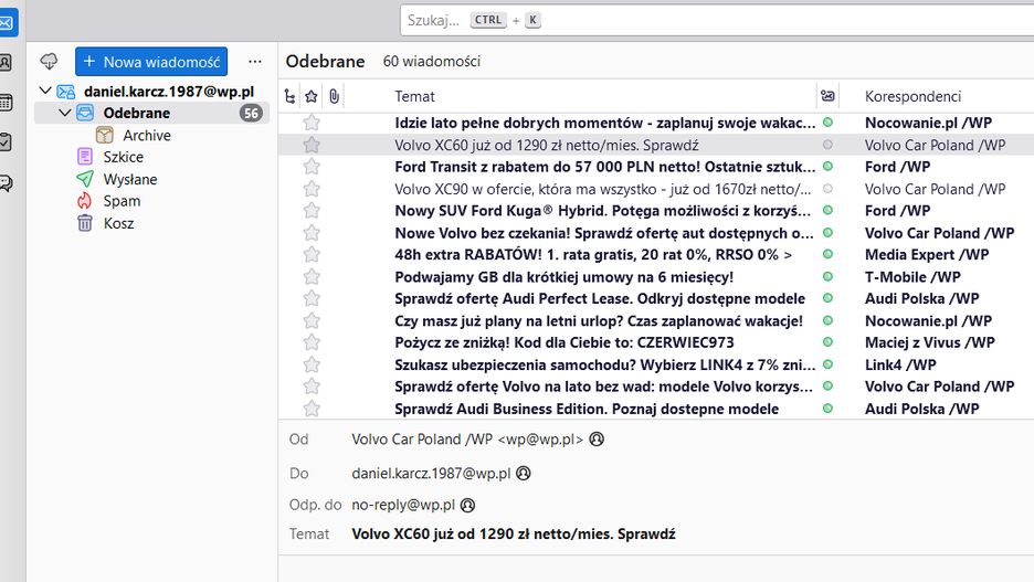 Gotowe. Po uruchomieniu aplikacji Thunderbird na komputerze docelowym uzyskujemy dostęp do wszystkich naszych kont pocztowych, a także wiadomości w ich obrębie.