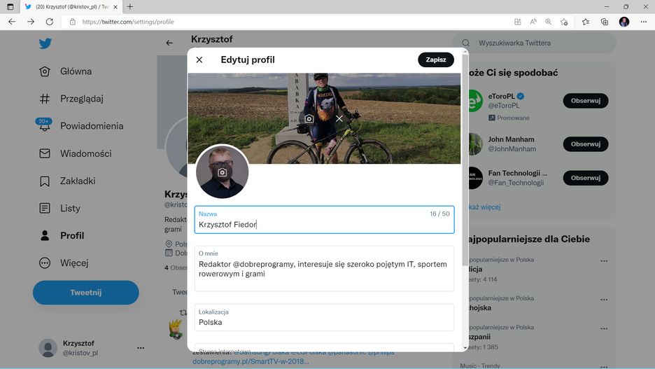 Logujemy się na platformie Twitter w dowolnej przeglądarce internetowej. Po lewej stronie ekranu odnajdujemy zakładkę Profil. W kolejnym kroku klikamy w przycisk Edytuj profil.