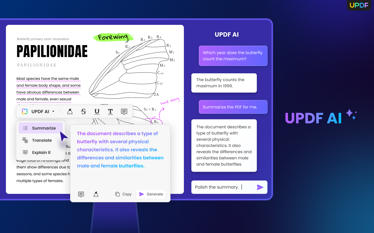 ● Skuteczne podsumowywanie: UPDF AI generuje zwięzłe podsumowania setek stron w kilka sekund. Jeśli musisz przeglądać długie dokumenty w pracy, UPDF AI znacznie ułatwi Ci zadanie.