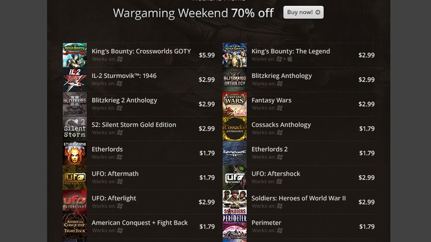 Wśród oferowanych tytułów znalazły się chociażby Blitzkrieg Anthology, tytuł, którego powinien spróbować każdy gracz, za 2,99 USD, Soldiers: Heroes of World War II w takiej samej cenie czy King’s Bounty: Crossworlds GOTY za 5,99 dolarów. Niestety w tej wyprzedaży po macoszemu potraktowano użytkowników Maców. Z całej listy mogą skusić się jedynie na King's Bounty: The Legend za niecałe trzy dolary.