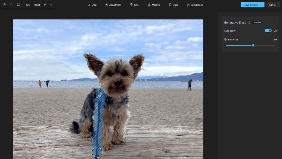 System przeanalizuje obraz i wycięty kawałek wypełni odpowiednią grafiką. Microsoft pokazał, jak sprawny jest to mechanizm na przykładzie "wycinania" postronnych osób oraz smyczy psa sfotografowanego na plaży. Powyższy efekt z wykorzystaniem AI w Zdjęciach w Windows 11 można uzyskać w kilka sekund.