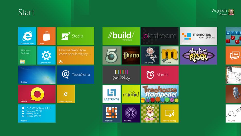 Słowo „pulpit” może nieco zdewaluować się wraz z premierą Windows 8 – w nowym systemie jest on używany, jak zostało to określone w tekście pomocy, w celach zachowania kompatybilności ze starszymi aplikacjami. Aplikacjami, które nie funkcjonują w nowym środowisku pracy opartym w całości o interfejs Metro. Po zalogowaniu w systemie naszym oczom ukazuje się ekran startowy, na którym umieszczone zostały różnych rozmiarów kafelki odpowiadające wybranym aplikacjom i funkcjom systemu. Zupełnie tak jak w Windows Phone 7. Kafelki są wielofunkcyjne – z jednej strony wyświetlają informacje dostarczane przez reprezentowane aplikacje (np. pogodę, tematy najnowszych wiadomości e-mail), z drugiej pozwalają na otwarcie danej aplikacji poprzez kliknięcie (lub, co wydaje się tu bardziej naturalne, wskazanie palcem). Kafelki można przesuwać i usuwać, a także pomniejszać i powiększać tak, aby wyświetlały więcej informacji. Aplikacja musi oczywiście obsługiwać interfejs Metro, aby można było jej kafelek „wyciągnąć” na ekran startowy.