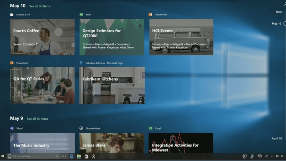 Dzięki Microsoft Graph dostępna będzie także funkcja Windows Timeline. Otrzymamy swojego rodzaju oś czasu, na której wyświetlane będą aktywności użytkownika w różnych aplikacjach. Znajdzie się tam informacja o dniu aktywności. W ten sposób możliwy będzie nowy sposób powrotu do rozpoczętej wcześniej pracy.