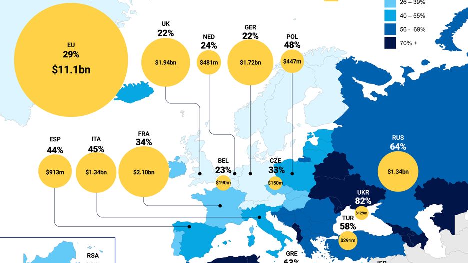 Znacznie lepiej, jeśli chodzi o udział komputerów z nielegalnym oprogramowaniem, sytuacja prezentuje się na tle krajów pogrążonych w głębokim kryzysie gospodarczym. W Grecji odsetek przytaczany w badaniu BSA wynosi 63%, a na Ukrainie aż 82%. Przy czym, mimo to, w każdym z tych krajów wartość oprogramowania bez licencji nie przekracza 200 mln dolarów.