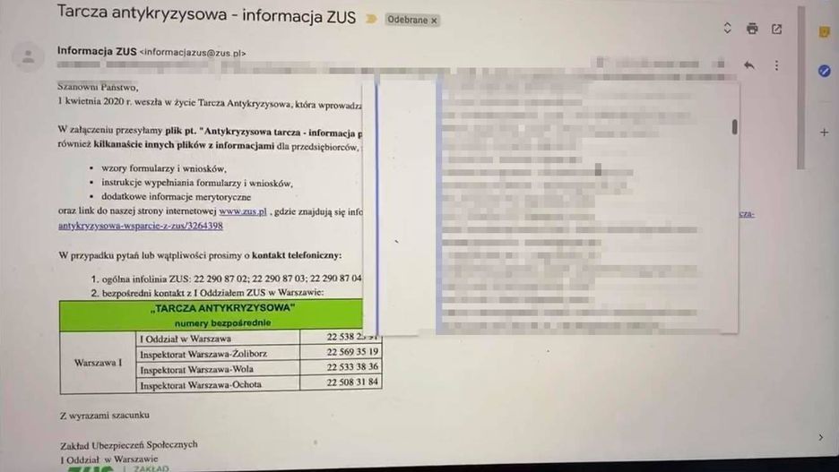 Zakład Ubezpieczeń Społecznych co najmniej od wczoraj rozsyła do przedsiębiorców e-maile informujące o szczegółach Tarczy Antykryzysowej. Na nieszczęście zainteresowanych, przy okazji ujawnia trochę danych osobowych.
